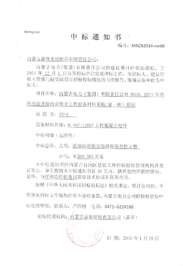 我單位在2015年1月19日成功中標(biāo)內(nèi)蒙古電力(集團(tuán))有限責(zé)任公司2010、2011年農(nóng)網(wǎng)改造升級(jí)結(jié)余資金工程設(shè)備材料采購中45-4標(biāo)段。