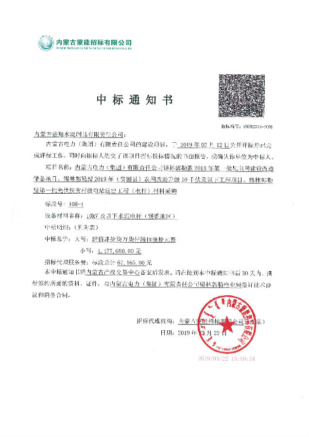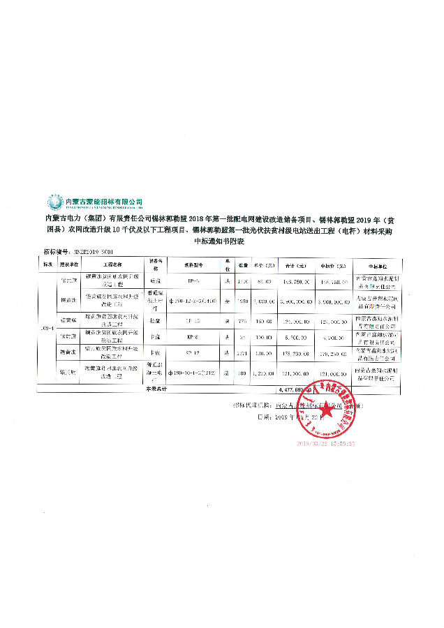 我單位于2019年3月22日中標內蒙古電力(集團)有限責任公司錫林郭勒盟2018年第一批配電網建設改造儲備項目、錫林郭勒盟2019年(貧困縣)農網改造升級10千伏及以下工程項目、錫林郭勒盟第一批光伏扶貧村級電站送出工程(電桿)材料采購