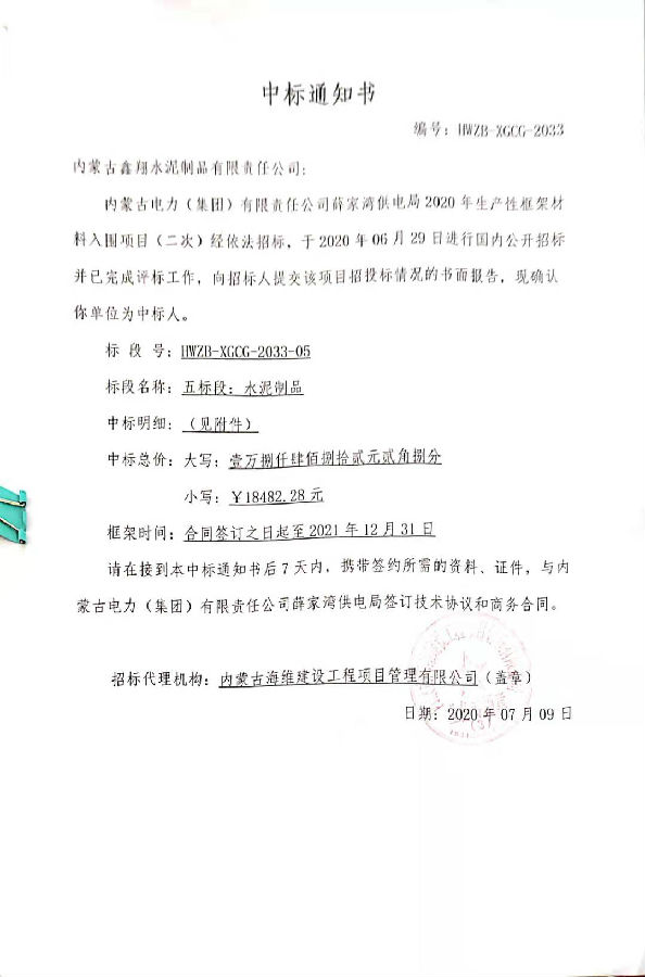 內蒙古電力(集團)有限責任公司薛家灣供電局2020年生產性框架材料入圍項目(二次)
