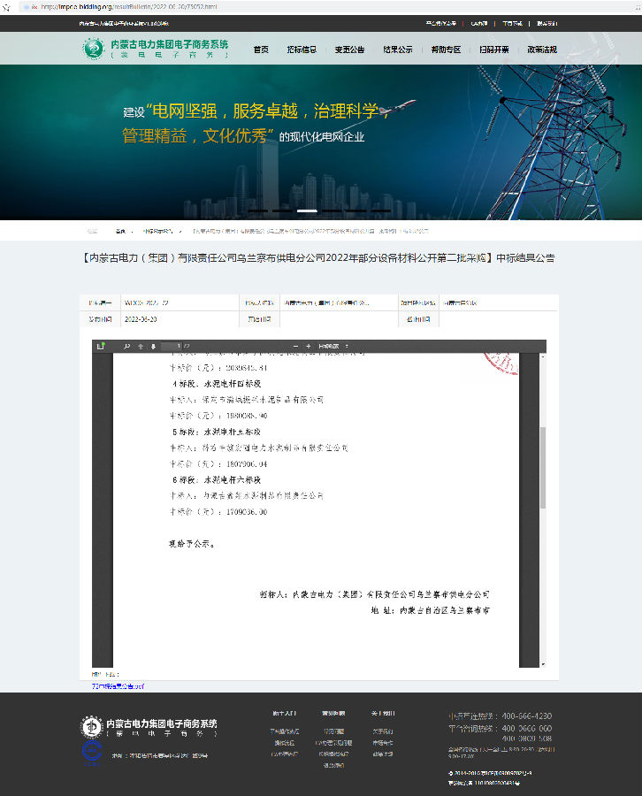 喜報!我公司新中標-內蒙古電力(集團)有限責任公司烏蘭察布供電分公司2022年部分設備材料公開第二批采購招標項目