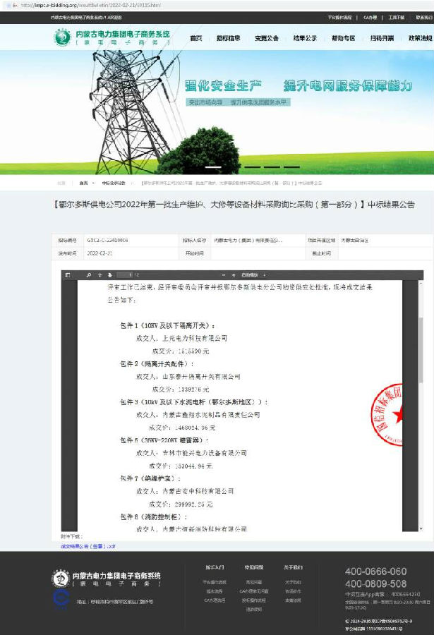 恭喜我公司中標!【鄂爾多斯供電公司2022年第一批生產維護、大修等設備材料采購詢比采購(第一部分)】中標結果公告