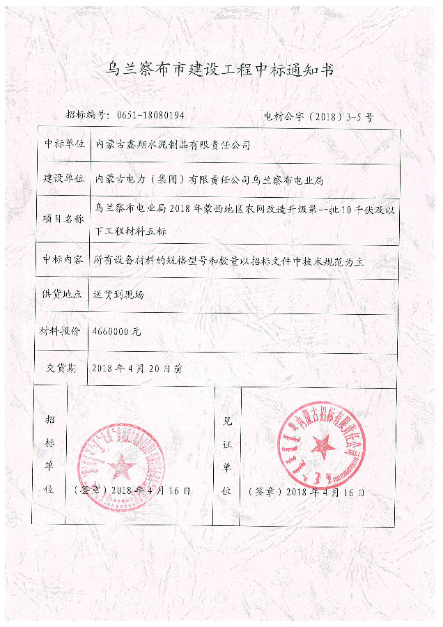 我單位于2018年4月16日,中標內蒙古電力(集團)有限責任公司烏蘭察布電業局2018年蒙西地區農網改造升級第一批10千伏及以下工程材料五標