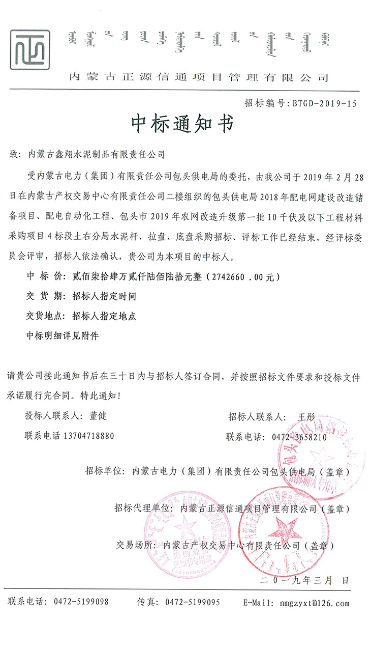 我單位于2019年3月中標內(nèi)蒙古電力(集團)有限責任公司包頭供電局2018年配電網(wǎng)建設改造儲備項目、配電自動化、包頭市2019年農(nóng)網(wǎng)改造升級第一批10千伏及以下工程材料采購項目