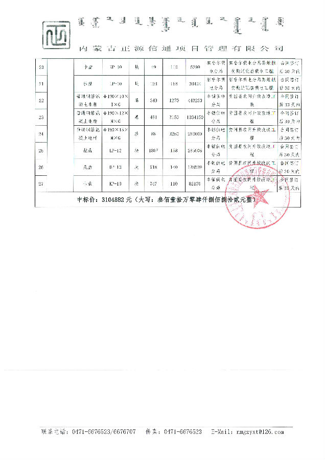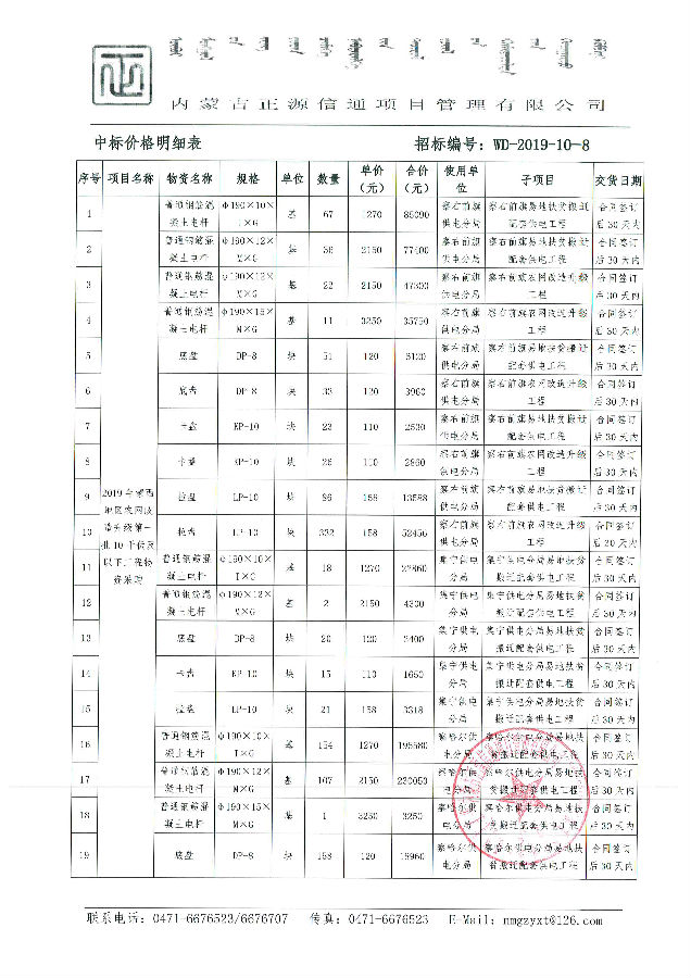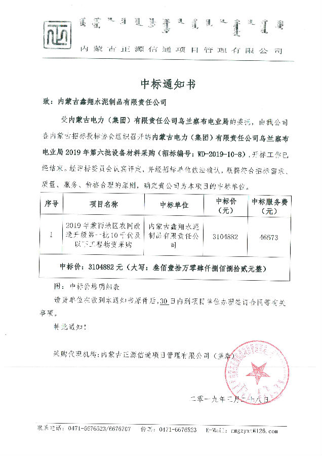 我單位于2019年3月28日中標內蒙古電力(集團)有限責任公司烏蘭察布電業局2019年第六批設備材料采購;項目名稱:2019年蒙西地區農網改造升級第一批10千伏及以下工程物資采購