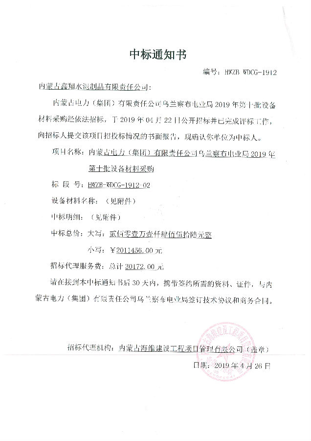 我單位于2019年4月26日中標(biāo)內(nèi)蒙古電力(集團(tuán))有限責(zé)任公司烏蘭察布電業(yè)局2019年第十批設(shè)備材料采購